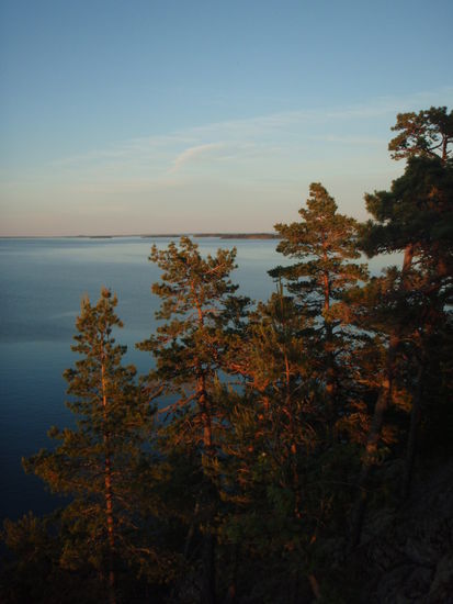 Am zweiten Tag legten wir gegen mittag an einem kleinen Kaufmannsladen an. Da wir ja nun ein Kajak besaßen und nichts mehr zu tragen brauchten konnten wir es uns jetzt erlauben, Luxusartikel wie schwere Bierdosen einzukaufen. Deswegen steuerten wir auch bald darauf die nächst beste Insel an und genossen den sonnigen warmen Tag mit entspannen,essen und Bier trinken. Dabei erlebten wir einen super Sonnenuntergang. Uns gegenüber lag eine andere größere Insel, dessen zu uns zugewantes Ende in Form einer Klippe steil ins Meer hinab fiel. Aus einer spontanen Idee heraus stiegen wir abends noch einmal in unser Kajak und setzten ans andere Ufer über um vom höchsten Punkt der Klippen aus, den Sonnenuntergang zu beobachten. Doch auch hier mussten wir Kaputze und Jacke tragen denn anders wären die Mücken kaum zu ertragen gewesen.