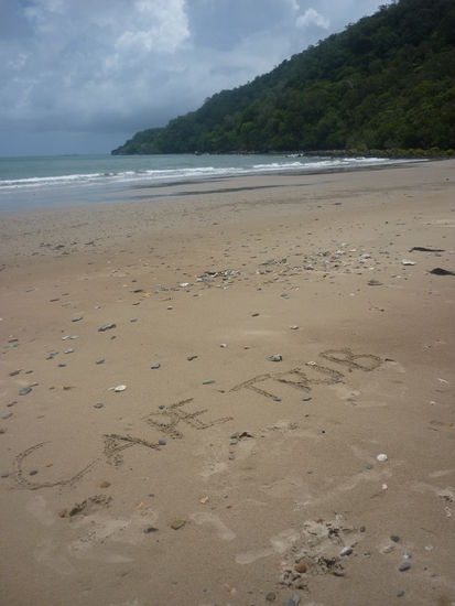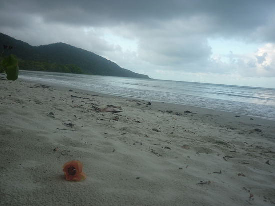 Gegen Nachmittag kamen wir endlich am Cape Tribulation an, wo wir uns auch gleich den Strand anschauten. Leider sind die Bilder alles etwas duester, weil das Wetter nicht so gut war, aber was erwartet man auch im Regenwald
