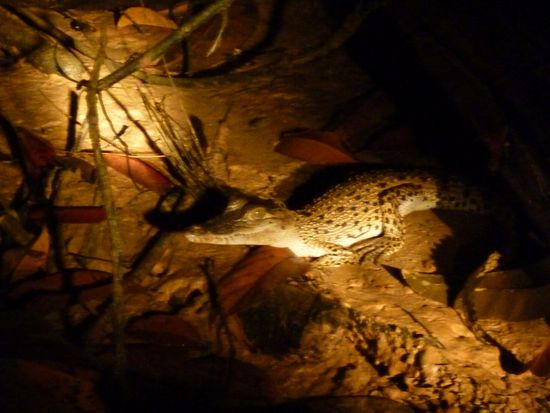 Abends machten wir eine tolle Bootsfahrt ueber den dunklen Fluss und sahen ab und zu rote Augen...das waren dann Krokodile. Zum Glueck kleine suesse.