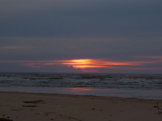 Auch der Sonnenuntergang am Strand verlangte nach Verperlung. Ausserdem wurden wir Zeuginnen eines brutalen Mordes> Eine Strandkrabbe stuerzte sich auf einen harmlos relaxenden Kaefer und zerrte ihn in ihr Loch. Er versuchte noch, zu entkommen, aber es gab kein Entrinnen...