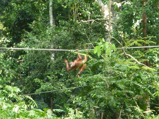 Im Sepilok Orang Utan Center gingen wir (natürlich nach mehreren Briefings) einen kurzen Weg über Holzstege zu der Fütterungsplattform der Orang Utans. "Vorgruppe" war eine Horde lustiger Makaken, dann kam der "Top Act", die Orang Utans. Wir hatten Glück und konnten erst eine Mutter mit Kind, dann einen älteren Orang Utan und dann noch einen "Teenager" beobachten, wie sie sich lässig an Seilen zu der Plattform schwangen und Bananen nahmen. Es war sehr beeindruckend, die Tiere mit ihren verschiedenen Charakteren zu beobachten. So war die Orang Utan Mutter recht ruhig und selbstbewusst, während der Teenie schüchtern und neugierig zugleich wirkte. Natürlich war es sehr voll, auf der Aussichtsplattform waren bestimmt so 100 Leute oder mehr versammelt, aber das wussten wir ja vorher.
