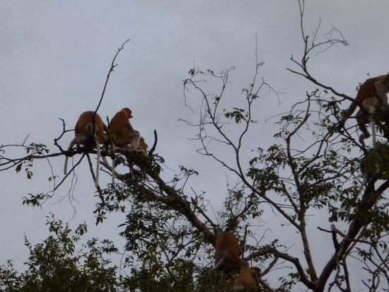 Nachmittags machten wir noch mal eine Bootstour über den Fluss und kamen aus dem Staunen nicht mehr heraus, denn zuerst sahen wir 2 freilebende Orang Utans an ihrem Schlafnest und dann ganz viele Nasenaffen! Bei der ersten Gruppe waren wir schon ganz begeistert und dann etwas enttäuscht, weil wir weiterfuhren. Da wussten wir noch nicht, dass wir während der ganzen Tour immer wieder Nasenaffengruppen sehen würden!