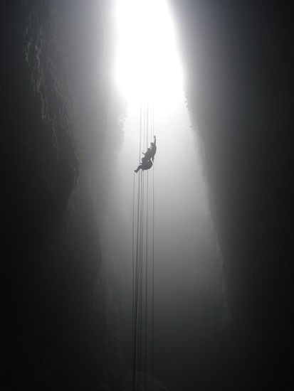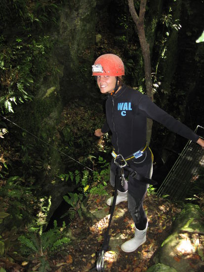 Nach der Sicherheitseinweisung konnte es losgehen...Zuerst mussten wir uns in eine 100m tiefe Schlucht abseilen. Das war der Abstieg in eine "neue Welt". Der erste Blick in den Abgrund war gewoehnungsbeduerftig, doch sobald wir am Seil hingen, war alles nicht mehr so schlimm.