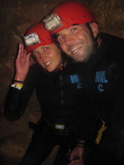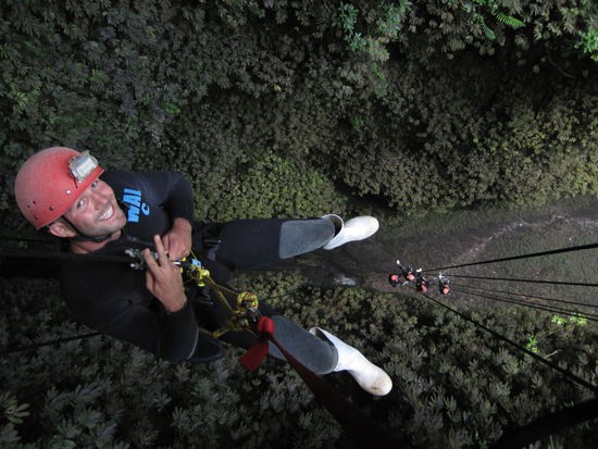 In den Hoehlen sind wir steile Abhaenge geklettert, mussten uns durch kaltes Wasser kaempfen, schwimmen und tauchen...in kleine Felsgruben springen in voelliger dunkelheit und Wasserfaelle raufklettern...die Wege waren steinig und felsig und bis auf das kleine Licht am Helm duster. Ab und zu war das ein seltsames und angsterfuellendes Gefuehl, doch das macht das Abenteuer erst spannend An einer bestimmten Stelle in den Hoehlen gab es eine kleine Besonderheit zu begutachten. Wir schalteten die Lichter aus und blickten zur Decke...es sah aus wie ein strahlender Sternenhimmel, doch es waren tausende Gluehwuermchen, die an der Decke hingen. Also gab es nach der ganzen action noch eine kleine bewunderswerte Belohnung.