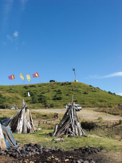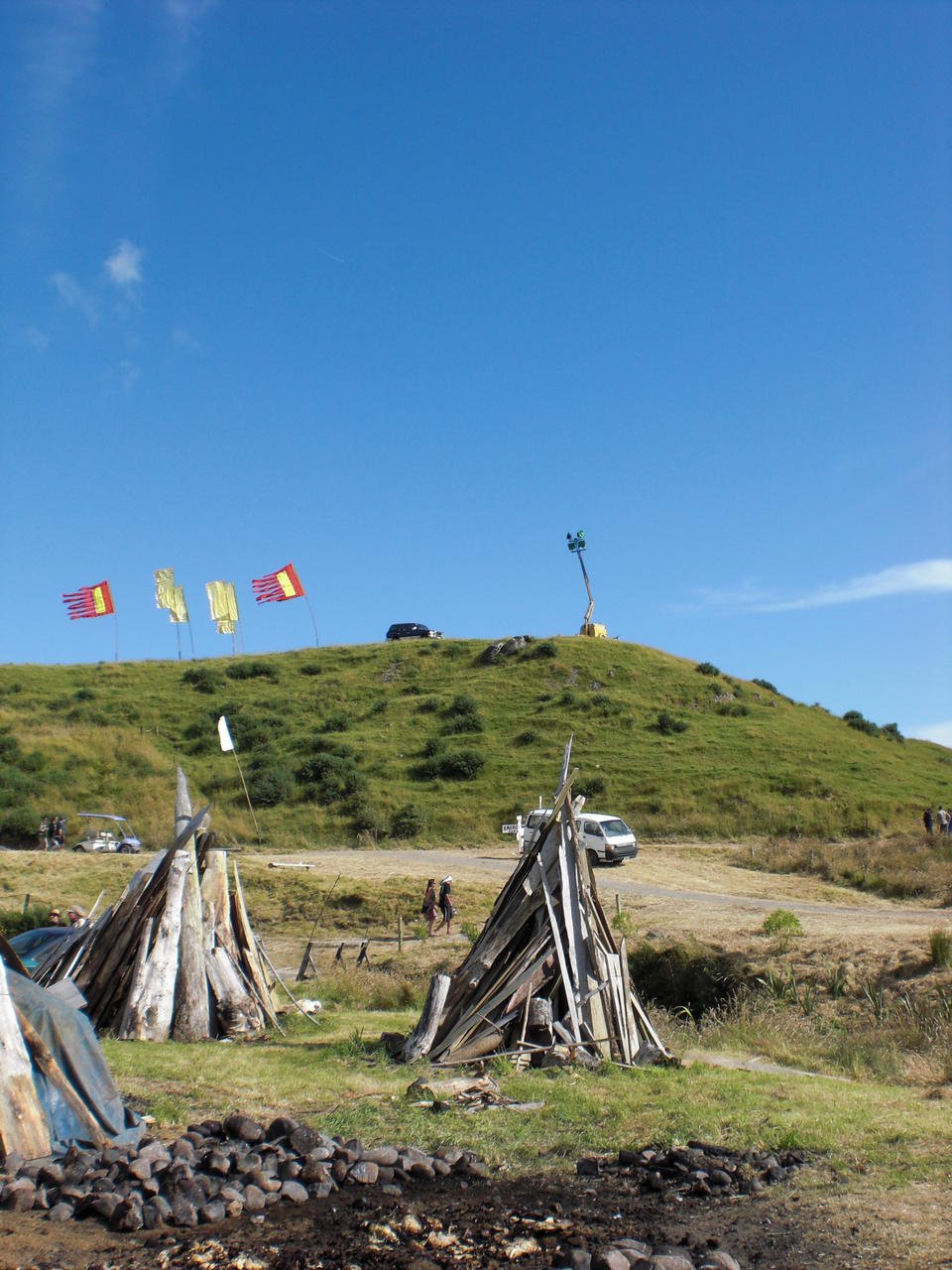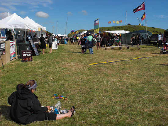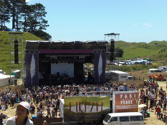 Ein 3-Tages-festival, umringt von Grashuegeln, mit 2 grosse Buehnen, Hippiepublikum, Hippielaeden, und viel mehr. Zuerst hatten wir uns auf der Campsite ein schoenes Plaetzchen gesichert und sind danach die Umgebung erkundschaften gegangen. Bei den ersten Staenden angekommen, wurde uns das sogenannte "Hangi" angeboten.