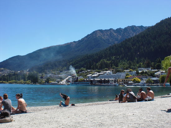 Die Stadt ist sooo wunderschoen...ich fang mal an zu beschreiben. Die Stadt an sich ist eher ein Partyoertchen, alles sehr klein und gemuetlich. Viele Seitengassen mit Bars in denen fast jeden Abend lifemusik gespielt wurde. Ausserdem viele Backpacker, grosse Auswahl an Partys und das schoenste die waaaaahnsinns Aussicht auf die Berge zwischen denen ein riesiger See liegt. Das Angebot an ausgefallenen Abenteuerangebot ist riesig, aber man brauch auch das noetige Kleingeld dafuer. An einem Tag war eine Skateboardcompetition in einem riesigen Skatpark und das fuer free. Das Wetter war an dem Tag besonders schoen und sonnig. Wir verbrachten den halben Tag dort und kaum zu glauben, wir trafen ein paar Maedels aus Duesseldorf die Marcel kannte. Wie schon erwaehnt die Welt ist soooo klein. Gemeinsam gingen wir nach dem contest an den See und dort war die Hoelle los...der komplette "Strand" - ist leider kein Sand sondern Steine- war voll mit Leuten und eine Party war mehr oder weniger im Gange. Jemand hat mitten drin ein paar riesige Boxen aufgestellt und einen Laptop ausgepackt und musik gespielt. Das war richtig toll, die Stimmung, die musik, die Aussicht, das Wetter und das wir ein paar Bekannte getroffen hatten, hat den Tag fast perfekt gemacht. Abends sind wir gemeinsam feiern gewesen, hatten die Clubs unsicher gemacht.