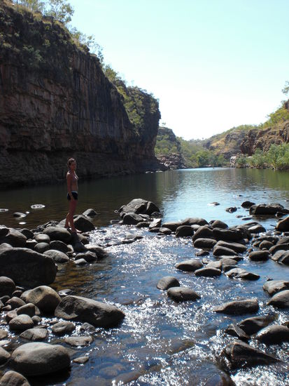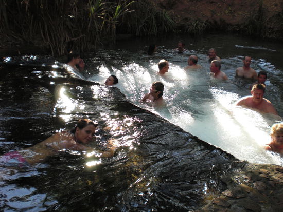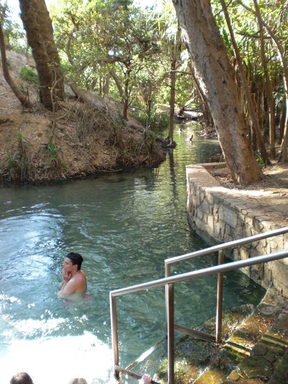Am naechsten Tag sind wir durch die Stadt Katherine gefahren und haben einen kurzen Stop fuer essen + trinken gemacht. Anschliessend sind wir zu den hot springs. Ein kleiner Bach in Katherine indem man baden konnte. Das wasser war so klar und warm und das for free. Das ist das schoene an Australien...so viele natuerliche Gewaesser die kein Eintritt kosten und wo das baden auch erlaubt ist... die Tage in Australien gehen so schnell rum, da momentan winter ist. Es wird um halb sieben dunkel, allerdings haben wir konstant ca. 28C
