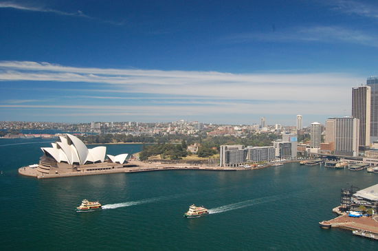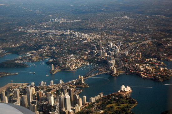 1,5 Stunden später ging es mit Virgin Blue weiter nach Sydney. Alleine der Anflug auf diese Stadt... die Harbour Bridge und die Oper von oben toll zu sehen. Und überall Wasser.