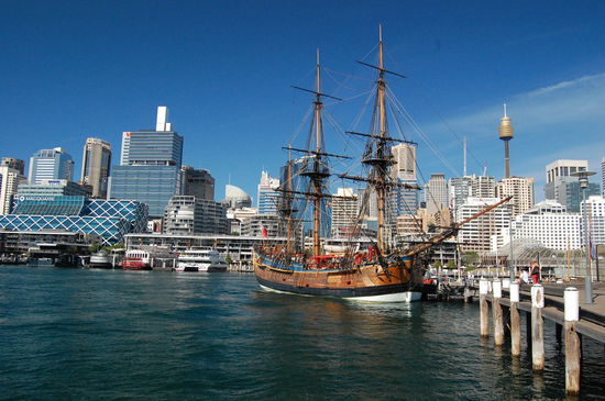 Darling Habour ist ein neues Viertel in Sydney wohl anlässlich der Olypischen Spiele 2000 gebaut. Hier gibts das Maritim Museeum mit der Endeaver, das Entdeckerschiff von James Cook, der erste Europäer in Australien (glaube ich jedenfalls mal, wenn nicht bitte berichtigen...).
