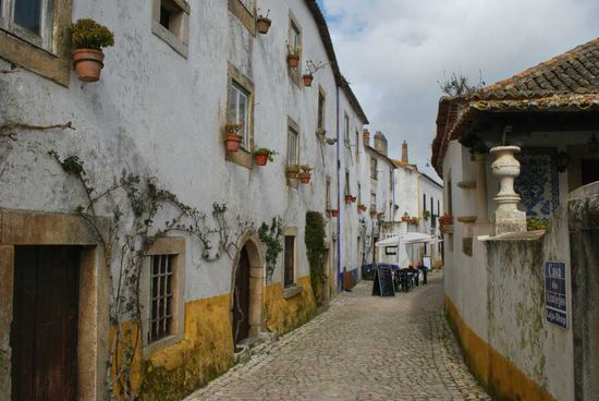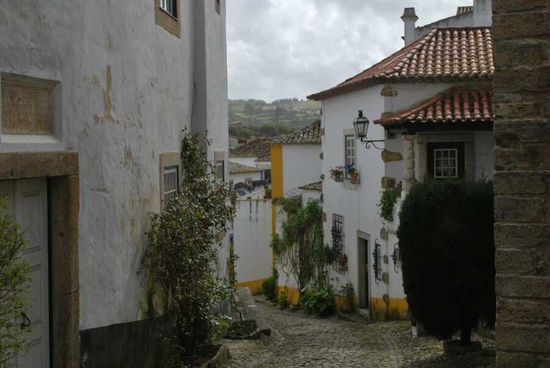 Gasen von Obidos, die vorhanden Großparkplätze lassen erahnen welche Menschenmaßen sich im Sommer durch die Gassen drängen