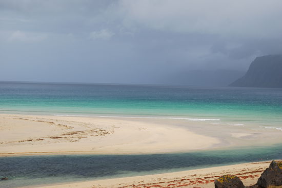 Wen ich Euch jetzt von Kilometer langen weißen Sandstränden berichte, feinstem Sand und Dünen schreibe , mag bei Euch die Vermutung aufkommen, das ich schon in Dänemark bin. Wenn ich Euch weiter von kristallklarem Wasser erzähle, welches den Blick auf die Tiefe des Grundes zu lässt, von einer zwischen Smaragd und türkis gefärbten See vor schwärme, die in gleichmäßig sich brechenden Wellen auf den menschenleeren Strand rollt, von Baden und Schwimmen in über 30 C warmen Wasser, mögt Ihr meinen ich bin schon in Portugal oder ich sei gar in der Karibik. Nein ich bin immer noch in Island und auch das gibt es hier. Ich will aber nicht verschweigen, das die karibisch gefärbte See 10 C Wassertemperatur hat, die Luft 8 bis 12 C warm ist, der Wind mit 17 m/s bzw. 8 bft. weht und ich meine Mütze gut festschnüren muss. Das Baden findet natürlich in einem der geothermal beheizten Frei- oder Hallenbäder statt.