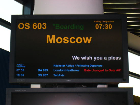 VIE-DME: Von: Wien International ging es mit dem Frühflug um 7.30 Uhr nach: Moskau / Domodedovo. Der Airbus 330 startete überpünktlich, und war auch nur mit etwa 30 Fluggästen besetzt. Dementsprechend früh war die Ankunft und noch schneller ging es dann durch die Passkontrolle und den Zoll. In meinem Rucksack hatte ich neben meinen persönlichen Dingen "gewichtige" kleine Gastgeschenke mit. Somit brachte der Rucksack 17,9 kg auf die Waage.