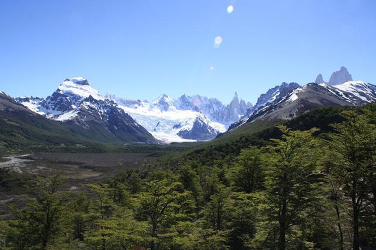 Dafuer war der Himmel des folgenden Tages azurblau, keine einzige Wolke zu sehen. So erblickten wir den Fitz Roy schon vom Hostal, warum eigentlich die Strapazen auf sich nehmen. An diesem Tag wanderten wir zur Laguna de Torre, einem weiteren beeindruckenden Berg. Das Wetter blieb so wie es begonnen hatte und ich hatte mal wieder einen Sonnenbrand auf der Nase.