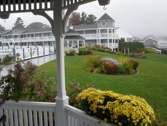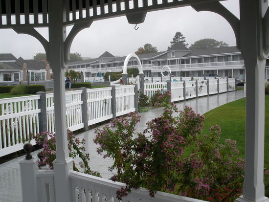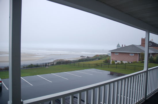 Das Hotel ist riesig mit mehreren Trakts. Unser liegt schön oberhalb der Strandpromenade mit Blick auf die rauen Wellen. Wir erhalten ein gemütliches Zimmer, wo wir mal unser Gepäck reinbugsieren inklusive der vielen Plastiktaschen aus unserem Kaufrausch. Es giesst in Strömen, die Ausläufer von Hurricane Kyle haben uns fest im Griff. Im Fernsehen informieren wir uns über die Position von Kyle. Dieser scheint in den nächsten Stunden Cape Cod zu streifen. In den USA gibt es Warnsysteme via TV zum Beispiel bei Flutgefahren. So ertönt immer wieder ein ziemlich durchdringender Signalton während dem laufenden Programm und auf einem Balken unten werden die umliegenden Orte aufgeführt, welche zur Zeit die meisten Regenmengen erhalten und damit in höchster Flutgefahr sind. Echt spannend... Kyle soll morgen an unserer Küste vorbeistreifen und vermutlich Nova Scotia treffen. Für den morgigen Tag melden sie weiterhin flutartige Regenfälle. Draussen regnet es Bindfäden und der Parkplatz wandelt sich langsam zu einem Swimmingpool. Von der schönen Küste ist nur wenig zu erkennen. Alles verschwindet grau in grau und das Tosen der Brandung ist zu hören.
