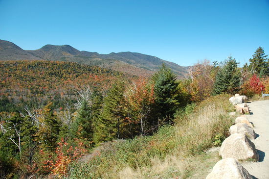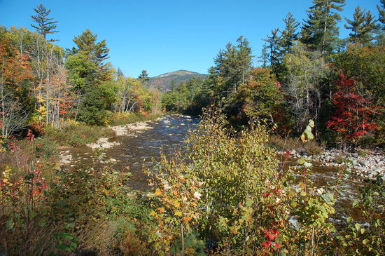 Für amerikanische Verhältnisse schon bald kriminell enge Haarnadelkurven führen uns auf den 914 m hohen Kancamagus Pass und ebenso kurvig geht's auf der andern Seite in ein höchst idyllisches Tal hinunter. Der Pemi Overlook, wo wir wiederum einen Halt einschalten, zeigt uns ein wildes schönes Tal, umrahmt von Bergen die irgendwo um die 1000 bis 1800 Meter hoch sein werden und übersät von herbstlichen Bäumen sind. Es ist wunderschön hier, und wir verstehen, warum die Strecke als einer der schönsten Neuenglands beschrieben wird!