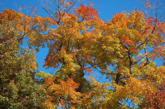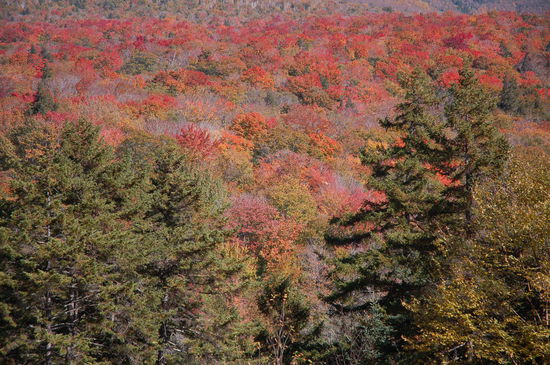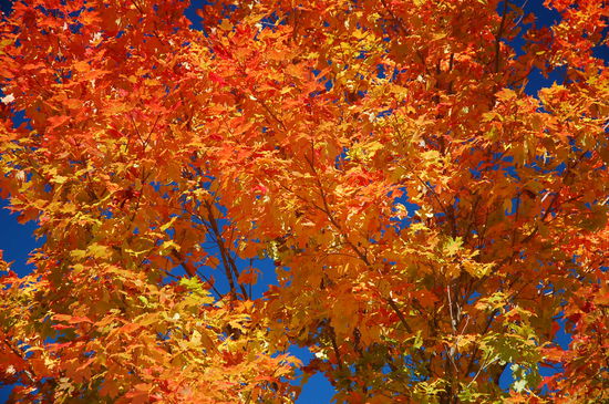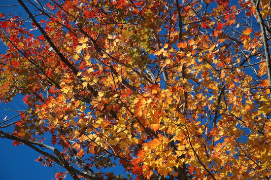 Die Leute werden Busweise herangekarrt und der riesige Parkplatz ist praktisch voll mit PW's. Davon lassen wir uns aber nicht abschrecken. Schliesslich gehören wir auch zu der neugierigen Gattung, die sich touristische Höhepunkte nicht entgehen lassen will! Der erste Höhepunkt sind die Ahornbäume, die die Parkplätze umgeben. Immer wenn wir denken, schöner kann es nicht werden, haut uns der Indian Summer noch eine farbliche Stufe mehr um die Ohren! Genau vor unserem Auto steht ein Ahornbaum, der unten noch leicht grün ist, dann in klare Gelbtöne wechselt und zuoberst in einem der strahlendsten Orange endet, die ich je gesehen habe. Dazu der stahlblaue Himmel im Hintergrund. Es ist zum Umfallen schön! Und es ist bei weitem nicht der einzige Baum, der so erstrahlt. Die ganze Gegend besteht daraus und man fühlt sich wie Alice im Wunderland!