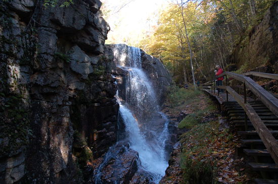 Schon bald ist die Fahrt zu Ende und es geht doch noch per pedes weiter. Auf Holztreppen und -stiege geht es in die enge Granitschlucht hinein. Linkerhand rauscht der Flume Brook an uns vorbei, manchmal als hoher Wasserfall und manchmal als breiter Fluss über Granitterrassen. Das Licht- und Schattenspiel der farbenfrohen Bäume gibt dem Ganzen einen besonderen Reiz. Nun, die Schlucht ist sicher malerisch, kennt man aber die Aareschlucht von Meiringen oder die Gletscherschlucht von Grindelwald, hält sich das Spektakuläre in Grenzen.