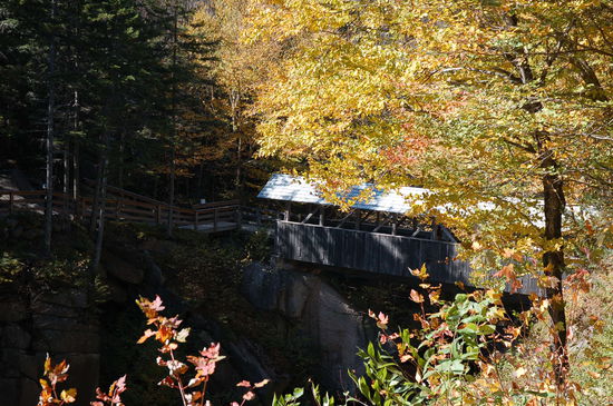 Auf der Rückseite des Visitor Centers orientieren wir uns an den Schildern, wo sich nun der Weg zur Schlucht befindet. Gerade wollen wir uns den steilen Hang hinauf schleppen als uns ein älteres Ehepaar anspricht und meint, wir sollen doch den Bus bis zum Eingang nehmen. Der Weg bis dorthin sei nämlich steil und mühsam! Für diesen Tipp sind wir übersportlichen Wanderfrösche natürlich äusserst dankbar. Und schon bald sitzen wir bequem in einem kleinen Bus und lassen uns königlich den Berg hoch chauffieren. Unterwegs gibt es bei einer wunderschönen gedeckten Brücke sogar einen Halt, so dass wir aussteigen und die malerische Brücke inmitten der Foliage fotografieren können. Was will man mehr?