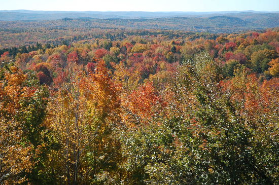 Doch obwohl kaum zu glauben, geht das Herbstmärchen weiter. Der Highway windet sich immer höher, die uns begleitenden Bäumen strahlen weiter und plötzlich erreichen wir einen grossen Parkplatz mit Raststätte und blicken in alle Himmelsrichtungen. Wir sind am 100 Mile Sky View angelangt! Sofort fahren auch wir auf den Parkplatz und blicken über ein Meer von roten und orangen Bäumen und Büschen. Die Aussicht ist schlicht ergreifend grandios und dank dem herbstlich klaren Wetter sieht man meilenweit übers hügelige Land. Von jeder Himmelrichtung leuchten uns die schönsten Farben entgegen. Ich finde kaum Worte um dies zu beschreiben. Es ist ein grandioses Finale unserer Herbstreise. Herbst in der Schweiz wird nie mehr dasselbe sein. Diese Farben übertreffen alles je gesehene!
