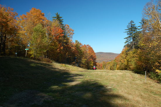 Nun in Sachen Verträgen ausarbeiten, wo man nicht haftbar gemacht werden kann, sind die Amis einsame Spitze, aber anständige Wanderwege zu bauen, da versagen sie! Der Wanderweg ist nichts anderes als die Skipiste. Schicken wir die Jungs und Mädels mal zum Verein Berner Wanderwege. Dort würden sie dann lernen wie man so was macht! Die Wanderung hinunter ist also mehr oder minder ein Wandern über Grasflächen zwischen Bäumen. Aber schön ist es trotzdem, mal abgesehen von der ebenso grandiosen kaum-existenten Beschilderung, die uns immer wieder zweifeln lässt, ob wir wohl noch auf dem richtigen Weg - tschuldigung - Piste sind. Kluge Kerlchens wie wir nun mal sind, sagen wir uns, es kann nur hinuntergehen...