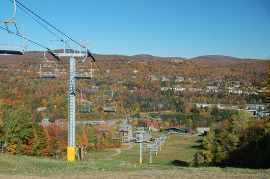 Mit der Sesselbahn geht es gemütlich auf den Mount Snow hinauf. Es ist eine herrliche Fahrt durch ein Meer von gelben und orangen Herbstbäumen. Und eine langsame... immer wieder drosselt die Sesselbahn die Geschwindigkeit. Vermutlich müssen sie jeden Kunden oben persönlich vom Sessel tragen, damit nicht noch ein Unfall passiert, der dann verklagt werden kann... Okay, jetzt werde ich zynisch! Aber wir geniessen die Fahrt. Die Aussicht ist grandios, die nachmittägliche Sonne scheint herrlich warm zu uns hinunter und die Bäume sind zum Verlieben schön.