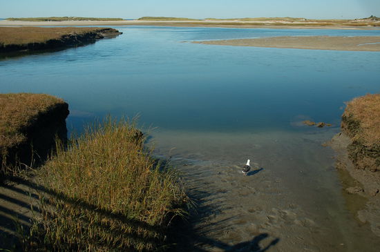Nachdem wir alles eingeräumt haben, begebe ich mich zurück zu Kris und John, der mir nun seine ganzen Empfehlung ausgedruckt und beschriftet hat. Da es ein strahlendschöner Spätnachmittag ist, wollen wir natürlich noch etwas anschauen gehen. In Yarmouth Port gibt es ein schönes Naturschutzgebiet, in das ein langer Pier hineinführt. Viele Leute sind am Flanieren und geniessen die ruhige Bucht. Unter dem Pier befindet sich Sumpfgebiet mit Wasserrillen, die sich vermutlich bei Flut füllen. So scheinen wir zur Zeit Ebbe zu haben, da die Rillen fast trocken sind. Es hat viele Vögel, die das Gebiet bevölkern. Am Horizont erblicken wir weissen Sandstrand. Wir spazieren hinaus bis ans Ende des Piers. Wir befinden uns an einer malerischen Bucht. John hat uns erzählt, dass es hier magische Sonnenuntergänge gebe. Doch dafür sind wir viel zu früh.