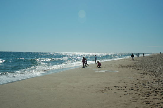 Unsere Fahrt geht dem Meer entlang weiter nach Chatham Harbor. Cape Cod hat ja die Form eines gebogenen Armes. Hier in Chatham befinden wir uns direkt auf dem "Ellbogen", den das Cape an der Stelle formt, wo sich Nantucket Sound und der Atlantik treffen. Chatham ist eine wohlhabende Stadt und bietet gute Gaststätten und eine einladende Mainstreet gemäss Reiseführer. Ein wenig erhöht über dem Strand erblicken wir wiederum einen schönen Leuchtturm. Am Strand selber flanieren viele Menschen und eine Hochzeitsgesellschaft stellt sich dem Fotografen.