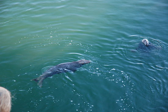 John gab uns den Rat unbedingt zum Hafen hinunter zu fahren, wenn die Fischer mit ihrem Fang hereinkämen. Das machen wir, und tatsächlich stehen viele Menschen bei der Abladestation und starren ins Wasser. Auch wir gesellen uns dazu und erblicken ausser einer idyllischen Bucht mit malerischen Fischerbooten nichts. Ein Fischerboot steht an der Abladerampe und schaufelt den Fang des Tages auf grosse Rampen, die das Ganze ins Innere des Gebäudes fährt. Und plötzlich kringelt sich das Wasser und ein grosser Kopf erscheint. Es ist ein riesiger Seelöwe. Nix mit netten kleinen Seehunden, das sind Viecher eines grösseren Kalibers. So wie es John erzählt hat. Die wären grösser als sein massiger Wohnzimmertisch. Und das scheinen sie tatsächlich zu sein. Elegant tauchen die grossen Tiere auf und verschwinden genauso schnell wieder im ruhigen Wasser. Doch viele strecken die Köpfe zum Wasser hinaus und beobachten mit Sperberaugen, was die Typen da auf dem Schiff machen. Und tatsächlich hat ab und zu einer der Fischer Erbarmen und wirft etwas vom Fang ins Wasser. Natürlich gibt das Zoff und man versucht sich den Fisch gegenseitig wieder abspenstig zu machen.