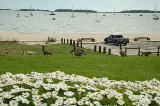 Nach einer Stunde kehren wir in den Hafen zurück. Das Wetter wird zusehends schlechter. Hohe Wolken bedecken den Himmel. Da aber immer noch ein wenig die Sonne scheint, fahren wir mit dem Auto zum John F. Kennedy Memorial, einem herrlichen Park mit einem schlichten Denkmal, das nach der Ermordung des beliebten Präsidenten 1963 errichtet wurde. Ein runde Steinwand zeigt das Profil von John F. Kennedy, davor hat es einen Brunnen mit einer Fontäne und Steinbänke drum herum. Die Wiese zwischen dem Memorial und dem Strand werden von vielen Kanadagänsen bevölkert, die hier vermutlich auf dem Weg in den Süden einen Zwischenhalt eingeschaltet haben.
