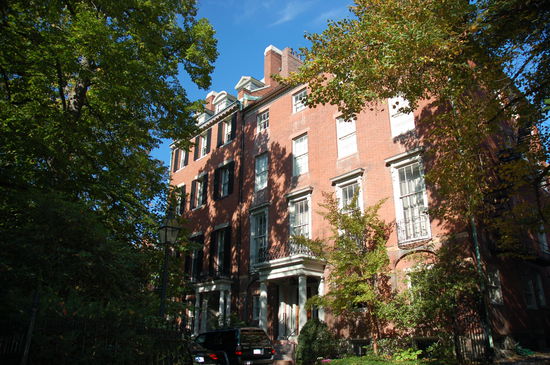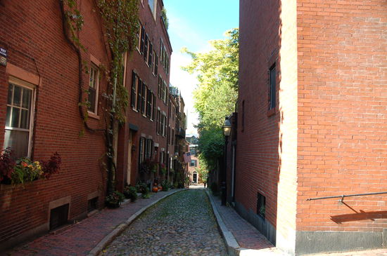 Wir spazieren rund um das grosse Gebäude und gelangen in das schönste Stadtviertel Boston's: Beacon Hill. Zwischen dem späten 18. Jahrhundert und den 1870er Jahren war der Südhang des Beacon Hill die bevorzugte Wohnlage Bostons. Die wohlhabende Elite zog hier erst fort, als die exklusivere Back Bay entstand. Der Südhang wurde ein Musterbeispiel für die Architektur des Federal Style (was auch immer das ist...), so dass die schönsten Häuser am Boston Common oder auf der Hügelspitze thronen.