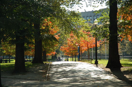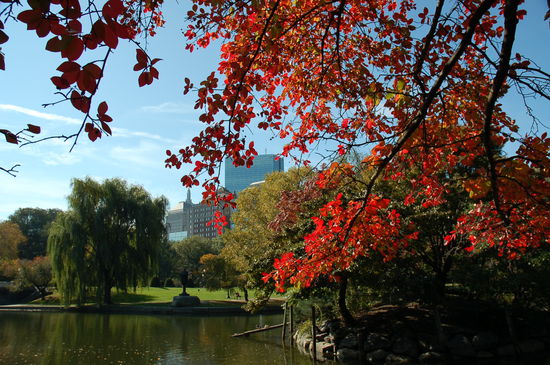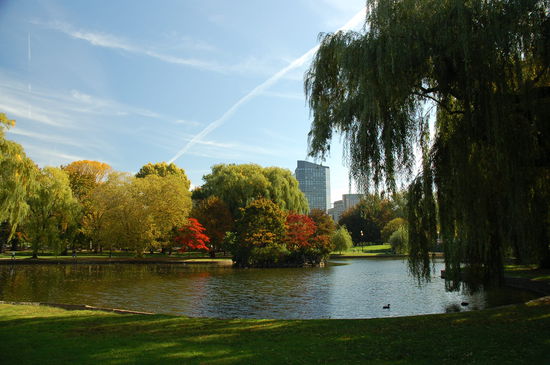 Und es ist ein herrlicher Ort. Südwärts säumen die Wolkenkratzer des Financial Districts den Park, nordwärts die roten Backsteinbauten des Beacon Hill. Viele Leute flanieren wie wir über die gemütlichen Wege, beobachten die süssen Backenhörnchen oder hören den Strassenmusikanten zu. Kleine Stände verkaufen Getränke und Eis und viele Leute liegen im englischen Rasen und geniessen die spätherbstliche Sonne. Ein friedlicher Ort! Gemütlich bummeln wir durch den Boston Common, überqueren die Charles Street und gelangen in den Public Garden. Es gibt herrliche Gärten und riesige herbstliche Bäume, die in den schönsten Farben leuchten. Über eine Brücke überqueren wir einen grossen See, wo im Sommer Schwanenboote gemietet werden können.
