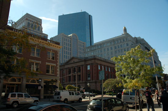 In einer propenvollen U-Bahn geht's unter dem Charles River hindurch zur Aquarium Station. Ein eigenartiges Gefühl. Ich mag schon U-Bahnen nicht sonderlich, aber dann noch unter dem Fluss hindurch... das gäbe einen netten Hollywood Katastrophenfilm! Doch wir überleben es und nehmen unsere Stadtbesichtigung dort auf, wo wir gestern aufgehört haben. Unser Weg führt uns wieder ins Herz des Financial Districts, vorbei am Old State House, der Kings Chapel mit dem ältesten Friedhof zum Old South Meeting House.