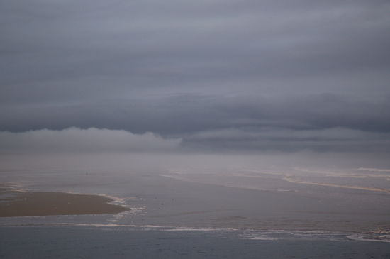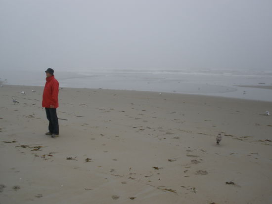Sportlich wie wir nun mal sind (...), entscheiden wir uns für einen morgendlichen Spaziergang am Strand. Alles was irgendwie wasserdicht ist, wird angezogen und dann geht's den Klippen entlang bis zu einer kleinen Brücke, die uns auf eine vorgelagerte Sandinsel führt. Ein grosser Parkplatz, der im Sommer vermutlich kaum einen freien Platz bietet, ist zu einem beachtlichen See angewachsen. So springen wir von Pfütze zu Pfütze bis wir den Sandstrand erreichen. Durch die Feuchtigkeit ist der Sand schön fest und damit angenehm zum Wandern. Über anderthalb Stunden spazieren wir den Strand hinauf und wieder hinunter. Es ist ein komisches Gefühl im zeitlosen Nebel zu laufen. Rechterhand rauschen die hohen Wellen des hurrikangepeitschten Atlantiks an uns heran. Linkerhand verschluckt der Nebel jegliche Aussichtsmöglichkeiten. Wir laufen und laufen im Grau und langsam schleicht sich das Gefühl ein wir seien die einzigen Menschen auf der Welt. Es könnte ja sein, dass wir plötzlich ein Zeitloch ohne zu merken durchschreiten und auf der andern Seite in einer völlig anderen Dimension herauskommen. Okay, ich weiss, Jürg findet auch, jetzt gehe aber die Fantasie mit mir durch. Das sind halt die Auswirkungen einschlägiger Literatur...