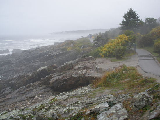 Der Himmel hat in der Zwischenzeit wieder seine Schleusen geöffnet und es giesst aus Kübeln. Wir ziehen uns ins Zimmer zurück und fläzen uns vor den TV. Akte X der Film beginnt grad. Mitten im Film während einer Werbepause begebe ich mich mal an die frische Luft und stelle fest, dass es nur noch nieselt. Schnell schmeissen wir uns wieder in die regenfesten Klamotten und spazieren südwärts dem Marginal Way entlang nach Perkins Cove. Der Weg verläuft oberhalb von malerischen Klippen, die natürlich von der starken Brandung richtiggehend malträtiert werden. Laut knallen die hohen Wellen an die Felsen und lassen riesige Fontänen in die Höhe schiessen. Es ist wirklich spannend. Wie wir sind auch viele andere Feriengäste unterwegs und geniessen die kurze Wetterentspannung.