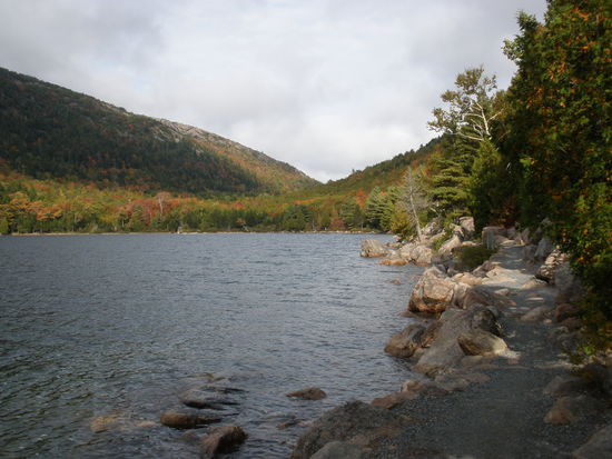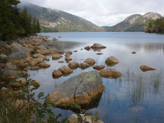 Wieder zurück am Ausgangspunkt setzen wir uns auf grosse Steine am Rande des Sees und geniessen still für uns den schönen Ausblick über den Jordan Pond. Nur wenige Leute sind uns begegnet. Die Stille ist wirklich herrlich. Die Berge und farbigen Bäume spiegeln sich malerisch im ruhigen Wasser und lassen alles sehr idyllisch wirken!