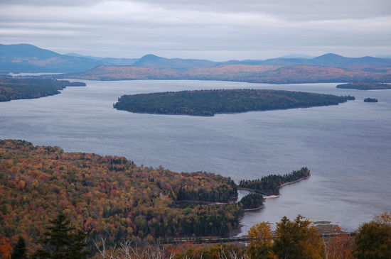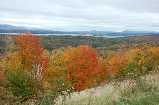 Uns zivilisationsgeschädigten Weicheiern reicht schon der eiskalte Wind um uns wieder ins warme Auto zu verziehen. Der Highway verläuft herrlich der Kante des Berges entlang, so dass man immer wieder schöne Ausblicke über den Norden Maines hat. Bei unserem ersten Halt hatten wir den Eindruck als ob der Herbst bereits über den Höhepunkt hinaus ist, der so genannte "past peak". Doch bevor der Highway hinunter zum See führt, sehen wir einen zweiten Aussichtspunkt. Sahen wir beim ersten nordwestlich über die Berge, gibt der Sightseeing Point hier den Blick mehr nordöstlich frei. Zu unseren Füssen liegt der Rangeley Lake. Der Reiseführer schwärmt vom Rangeley Lake State Park, welcher im Sommer ein Paradies für alle Naturfreunde ist. Schwimmen, Angeln, Vögel beobachten, Bootfahren und Zelten ist dann angesagt.