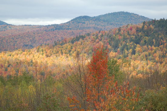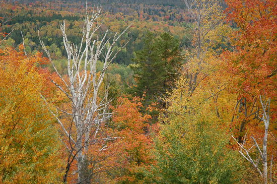Obwohl nur ein, zwei Kilometer von unserem ersten Aussichtspunkt entfernt, leuchten hier die Bäume in einer ganz anderen Intensität. Unser Blick reicht bis an den Horizont über ein farbengesäumtes Baummeer. Gleich beim Parkplatz hat es riesige Birken und sonstige Laubbäume, die sich uns in den schönsten Farben präsentieren. Trotz dem wolkenverhangenen Himmel gibt es eindrucksvolle Fotos zu schiessen. Was für ein schöner Ort! Übrigens trennen uns hier noch ca. 50 Meilen Luftlinie von der kanadischen Grenze