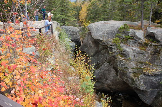 Es geht weiter. Wir erreichen das Bear Valley und damit die schöne Grafton Notch. Eine Notch ist übrigens eine Schlucht. Und so geht die Fahrt durch dramatisch hohe Felsen hinunter ins Tal. Unterwegs laden immer wieder Wanderwege zu Touren ein. Auch der Appalachian Trail kreuzt hier unseren Highway. Auf einem grossen Parkplatz biegen wir zu einem der vielen Wasserfälle ab. Hier hat es ziemlich viele Leute. Nach unserer einsamen Rundfahrt schon fast zu viel! Auch Motorhomes blockieren mehrere Parkplätze, so dass wir immer wieder einen kurzen Blick hinein wagen, um zu schauen wie wir unsere Ferien nächstes Jahr verbringen werden.