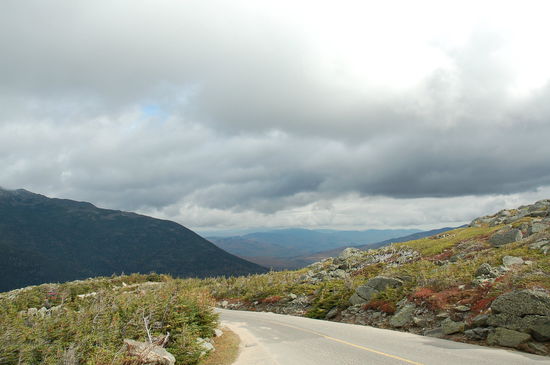 Aber Tatsache ist Tatsache und so fahren wir halt nur zur Hälfte den Gipfel hoch, natürlich schön brav im angepassten Tempo. Die Anleitung unten war idiotensicher! Schliesslich haben wir Amis vor und hinter uns, die nur schnurgerade Freeways gewohnt sind... Schnell einmal erreichen wir die Baumgrenze und haben einen herrlichen Ausblick aufs Tal und die umliegenden Berggipfel. Schien unten noch ein wenig die Sonne, weht hier ein kräftiger Wind dicke Wolken heran, und wir können uns die rasanten Wetterumschwünge nun bestens vorstellen.