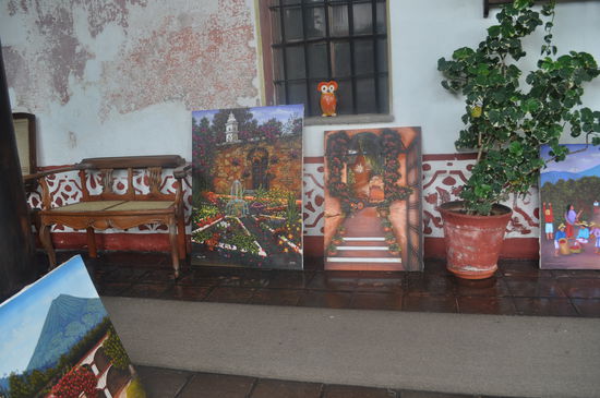 Heute Morgen breitet ein Maler sein Angebot im Laubengang, gleich vor den Zimmern auf. Geschäftige Angestellte in den typischen Trachten huschen vorbei, Touristen werfen einen Blick in den romantischen Garten. Ich lasse alle Eindrücke auf mich einwirken, erledige ein paar mails, bringe meine Notizen der letzten Tage auf den neuesten Stand. Irgendwann gegen Mittag wird da wo früher die Bar war, die grosse Türe geöffnet. Museo steht auf dem Schild und drinnen glaubt man sich in eine Ritterburg versetzt. Ein schwerer Tisch und Stühle mit hohen Lehnen stehen da. Im grossen Kamin brannte früher abends ein Feuer und von den Wänden grüssen alte spanische Ritter und edle Damen. Die freundliche Kellnerin bringt mir einen Liquado de piña, einen frischen Ananasdrink.