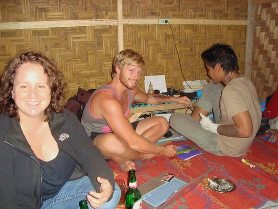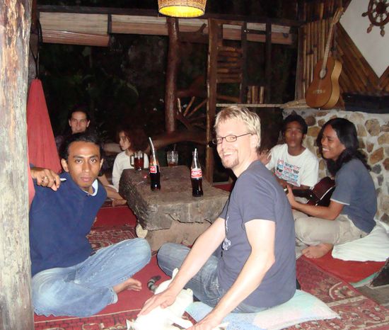 Trotz Erdbeben - oder gerade deswegen - merken wir wieviel Glück und Freude wir bei der Dschungeltour hatten. Das wird uns die nächsten zwei Tage in Bukit Lawang nochmal bewusst - hier trinken und feiern wir mit Assani, nachdem dieser mit den Australiern zurück von der 3-Tages-Tour ist.