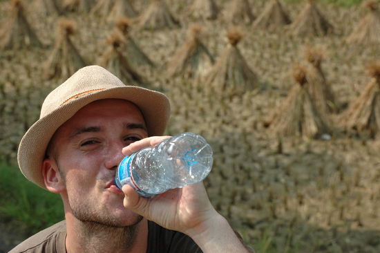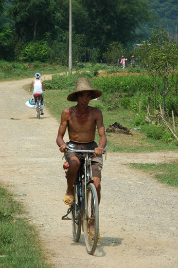 Klingt einfach, ist es prinzipiell auch, war aber viiiiiiieeeeeel zu heiss und nach nicht all zu langer Zeit war die wohl doch noch nicht ganz frische Julia sehr erchoepft. Ich hatte ausserdem keine genaue Karte der Umgebung. Nur die Ablegestelle der Bambooboote als Ziel. Als uns dann der etas schwehr befahrbare Weg in ein Feld fuehrte drohte die Situation zu eskalieren. Julia war stinkig (!!!) und/oder verzweifelt. Genau in diesm Moment gelang mir der unfreiwillige Geniestreich. Der Weg war sehr schmal und links und rechts von kleinen Graeben flankiert. Eine kleine Unachtsamkeit und ich verlor das Gleichgewicht. Ich wollte mich mit einem Bein abstuetzen, doch da wo ich den Boden des grasbewachsenen Grabens erwartete war Luft. Noch gut einen Meter Luft und dann Schlamm. Der Tag war gerettet. Ich steckte bis zum Knie im Schlamm das Fahrad ueber, teilweise auf mir und mein Oberkoeper lag in einer Brennnaesselstaude. Julia konnte ihr lachen schon bei der Frage ob ich mich denn verletzt haette schon nicht mehr unterdruecken. Ich hatte mich nicht verletzt und Julia konnte den restlichen Weg relativ beschwerdefrei, manchmal sogar lachend, weiterfahren.
