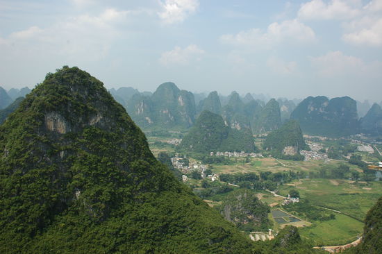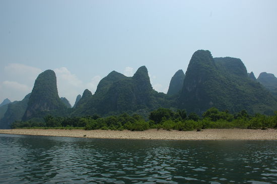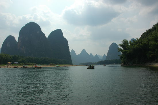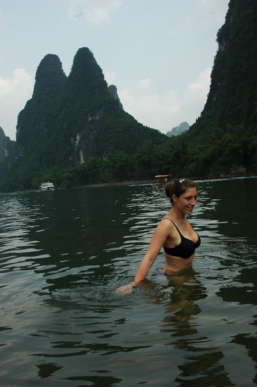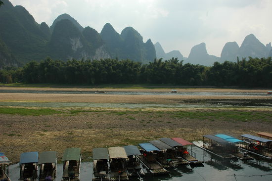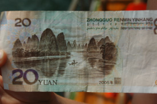 Die Wanderung, die fuer den letzten Tag in Yangshuo geplant war haben wir wegen der grossen Hitze gestrichen. Die Bootsfahrt auf dem Li-Fluss haben wir aber gemacht. Wunderschoen, die Karstberglandschaft rundherum. Wir haben natuerlich auch die Stelle gesehen, die auf dem 20 RMB-Schein abgebildet ist und davon Fotos gemacht. Das machen alle Touristen so.