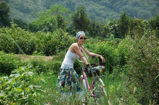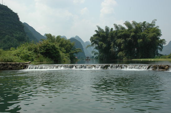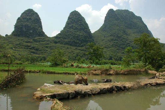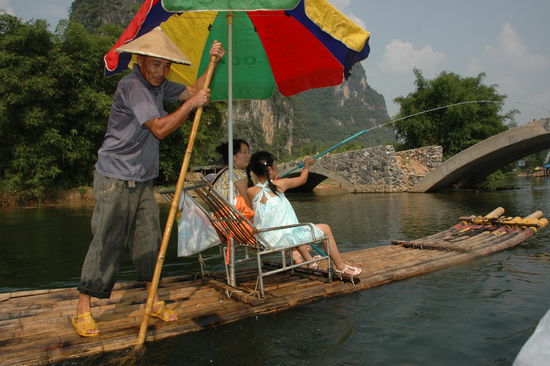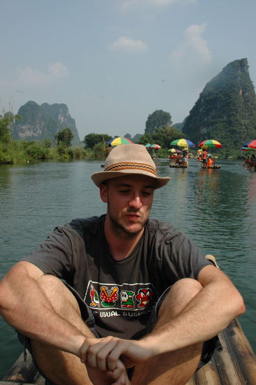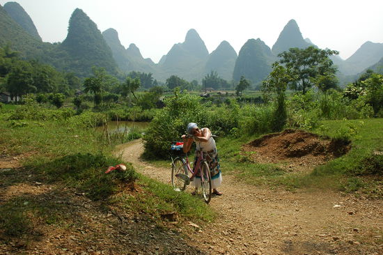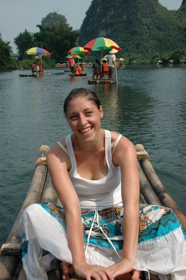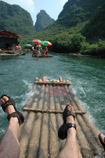 Am Morgen des dritten Tages in Yangshuo fuehlte Julia sich wieder deutlich besser und wir fuhren mit dem Fahrrad einige Stunden dem Yulong He (Fluss) entlang um dann eine Bamboobootsfahrt auf darauf zu geniessen.