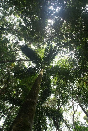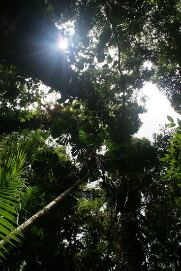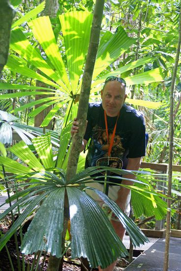 Heute besuchten wir das Rainforest Discovery Center, das in der Hauptsache daraus besteht, auf Holzwegen durch den Regenwald wandern zu können. Da sich diese Wege auf verschiedenen Höhen befinden, kann man alle Ebenen des Waldes erleben. Zum Schluss besteigt man einen Turm und ist somit auf Du und Du mit den Baumkronen. Hier wächst vom handelsüblichen "Hornbach-Farn" bis zur riesigsten Würgefeige alles. Es herrscht eine unglaubliche Vielfalt an Pflanzen. Zwischendrin sind öfters Info-Stationen, wo die Früchte erklärt werden und vor allem die Schlangen, Frösche und Vögel.