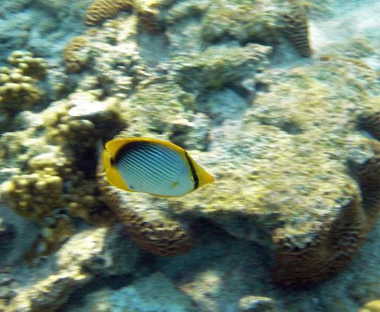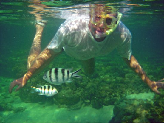 Dann ging es los, auf der Westseite kann man ganztägig schnorcheln. Zu erst mußte das flache Stück, mühsam mit den Flippern schlurfend, überwunden werden, bevor man sich im Korallengarten "niederlassen" konnte.