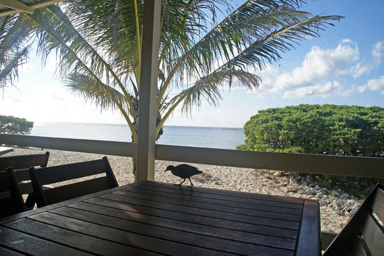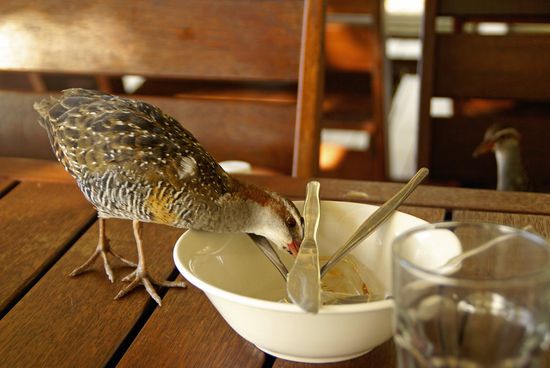 Beim Frühstück auf der Terrasse am Meer hiess es permanent sein Essen gegen die hungrigen und frechen Hühnchen zu verteidigen!