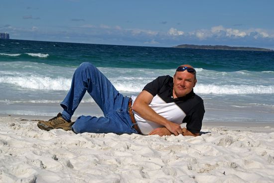 Immer weiter ging es küstennah, bis Jervis Bay, einer Halbinsel. An der Hyam Beach soll es angeblich den weißesten Sand der Welt geben. Bin gespannt, ob das mit meiner Sandsammlung oder mit Chefchens Thai-Strand vereinbar ist, oder einfach nur "Werbung". Weiß ist er jedenfalls ohne Zweifel.