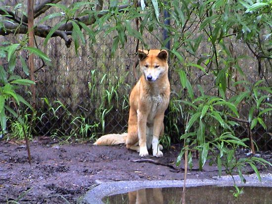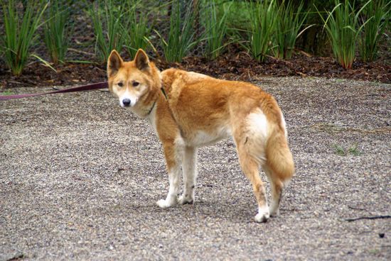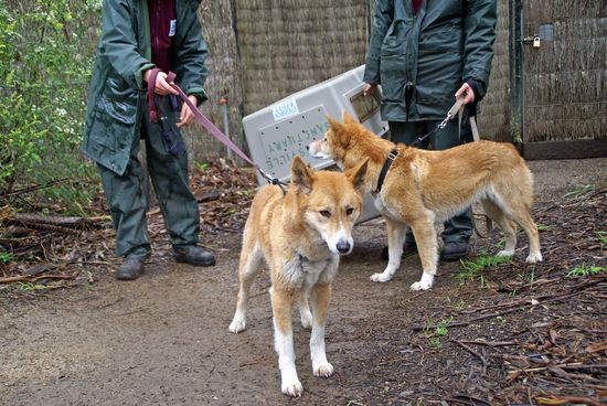 Die Tierpfleger gehen jeden Tag mit den Dingos an der Leine spazieren. An diesem Tag waren die 2 Dingos das erste Mal auf diesem Weg unterwegs und deshalb sehr aufgeregt und nervös.