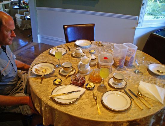 Ganz im englischen Stil des Hause, war auch das Frühstück. Wie in einem Herrenhaus wurde auf Goldrandtellern serviert und mit Goldbesteck gegessen. Gebackene Bohnen und Schinken konnten wir gerade noch abbiegen, die Eier und gebratene Tomate reichten völlig! Die Orangenmarmelade war der Traum!